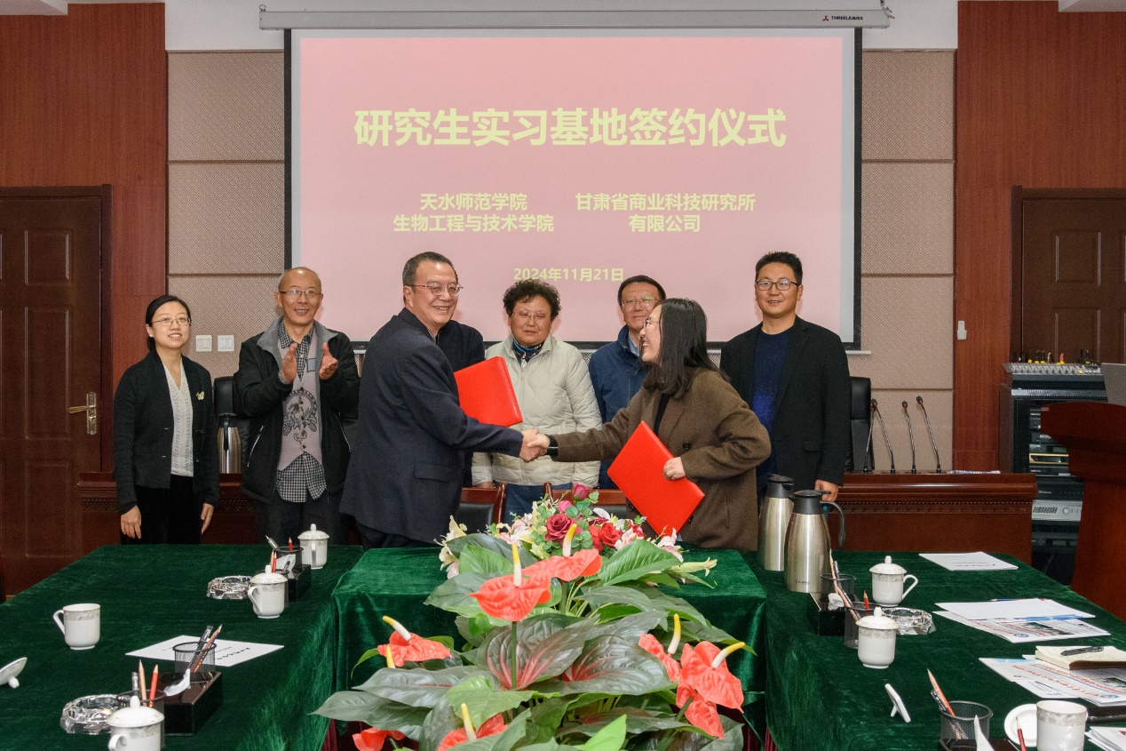 2024年11月22日,PP电子游戏平台网站pp电子平台官网入口刘艳梅副院长、赵菲轶教授、袁毅君教授、郭志刚研究员和曹铭老师一行5人,赴甘肃省商业科技研究所有限公司、兰州百灵生物有限公司签订生物与医药研究生实习基地相关协议。
