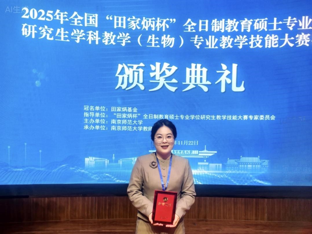 11月21日至23日,2025年全国“田家炳杯”全日制教育硕士专业学位研究生学科教学(生物)专业教学技能大赛决赛在南京师范大学举行。pp电子平台官网入口2023级学科教学(生物)研究生潘雪萍荣获大赛三等奖。