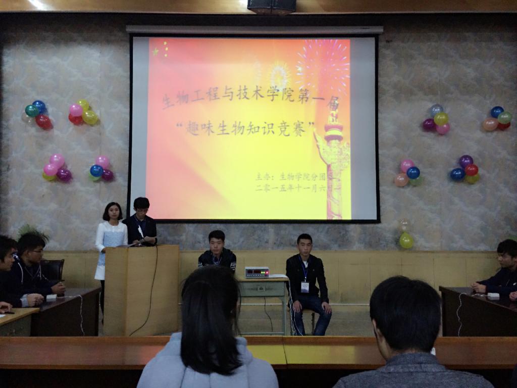 为了丰富校园文化生活,由pp电子平台官网分团委主办,学生会承办的“pp电子平台官网入口第一届趣味生物知识竞赛”于11月6日晚在二号报告厅隆重举行。pp电子平台官网分团委书记杨金凤、辅导员姬静、特邀教师李娟娟、化工学院学生会主席何东城及pp电子平台官网学生会主席马运青、李锐锐、石福磊及300多名同学观看了此次竞赛活动。