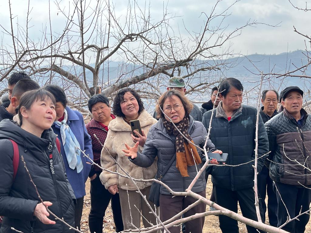 在实践教学中,中心主任郭志刚现场示范春季修剪技术,手把手指导果农调整树形结构,果农们有的用手机录像,有的现场比划模仿,纷纷表示这种讲解+实操的培训很实用,解决了很多实际问题。