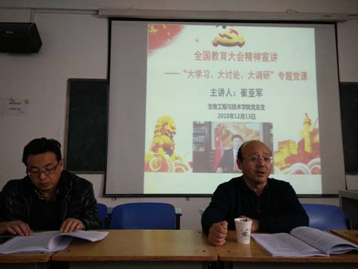 2018年12月13日,pp电子平台官网举办“大学习、大讨论、大调研”活动专题党课,特邀学校党委常委统战部部长崔亚军同志讲授学习贯彻全国教育大会精神宣讲报告,pp电子平台官网全体教职工和学生党员及学生班干部参加报告会。会议由马纲书记主持。