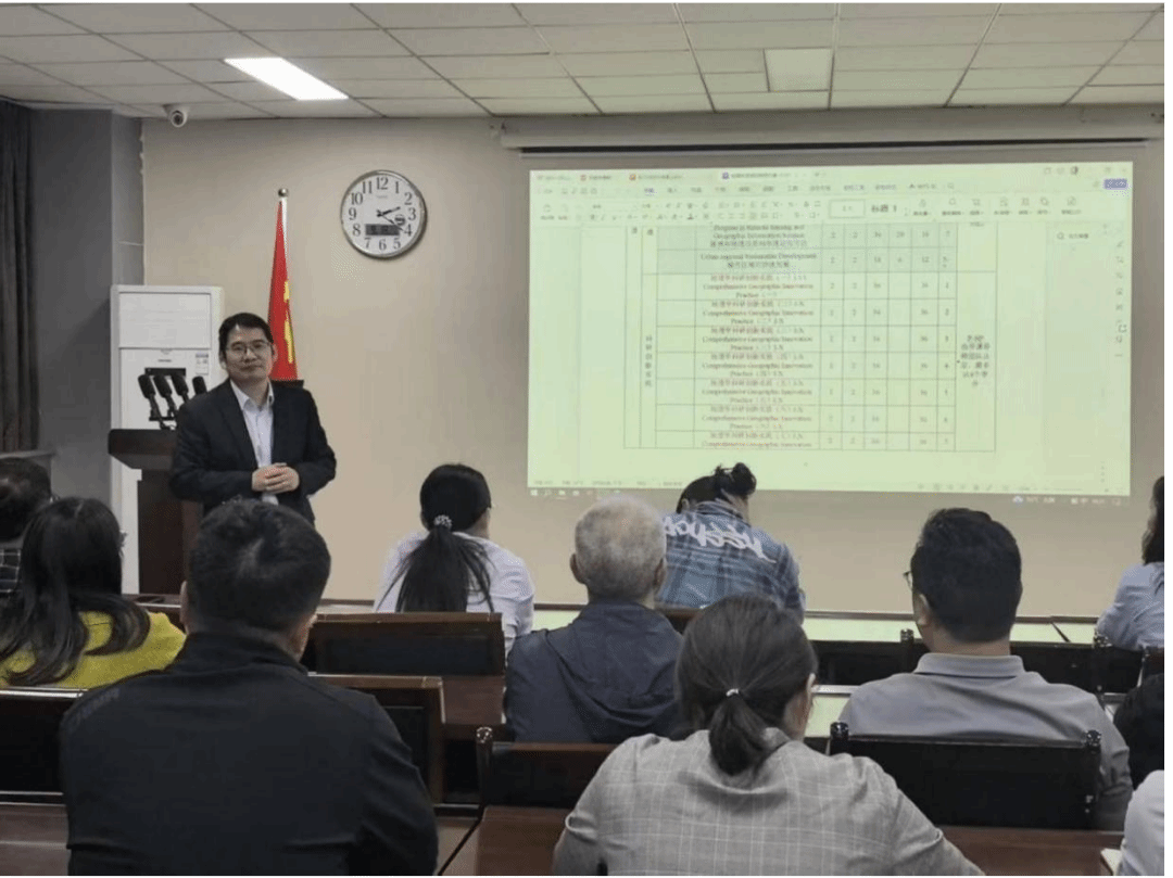 首先,在简要介绍本次会议议程后,丁志伟带领与会师生共同学习了地理科学与工程学部学科推进大会会议精神,并针对新培养方案修订理念和课程设置方案进行了详细介绍。针对教学改革实践,丁志伟指出,此次改革聚焦“2+2模式”,强化学生技能与市场需求对接,同时重视理论和实践的知行合一;通过引入线上资源辅助教学、优化课程资源,建设混合式课程和智慧课程提升教学质量;课程体系调整明确了“STEP”的学分结构与课程类型,大幅度释放科研时间并开设特色课程、推行导师制,鼓励学生选修实践创新类课程。此外,他还强调在改革的过程中,实践是重中之重,必须增加野外实习时间,建立灵活实习申请机制,提升学生的地理实践力。