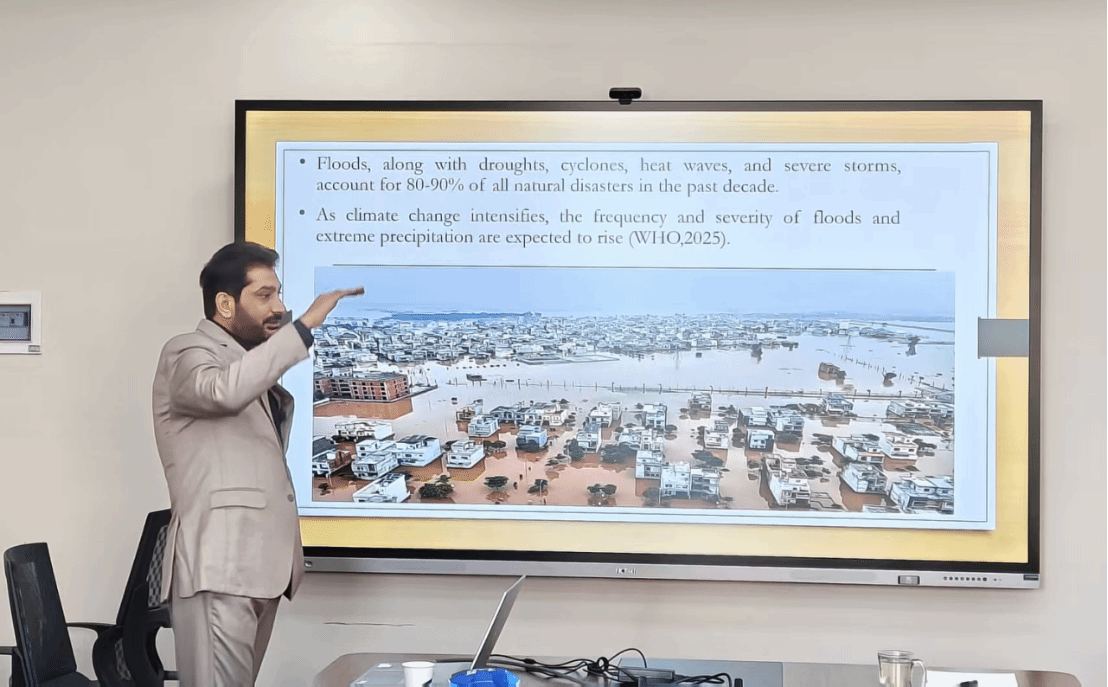 会议伊始,秦明周对Asim Shahzad学术背景与主要研究方向进行了简要介绍,并对其来访表示热烈欢迎。Asim Shahzad结合最新研究成果,系统分析了2025年巴基斯坦特大洪水的成因、规模及其造成的严重破坏。他通过详实的数据与典型案例,展示了洪灾对农业生产、基础设施、居民生活以及生物多样性带来的深远影响,指出气候变化正显著提高极端天气事件的发生频率与强度,成为全球生态安全的重要威胁。