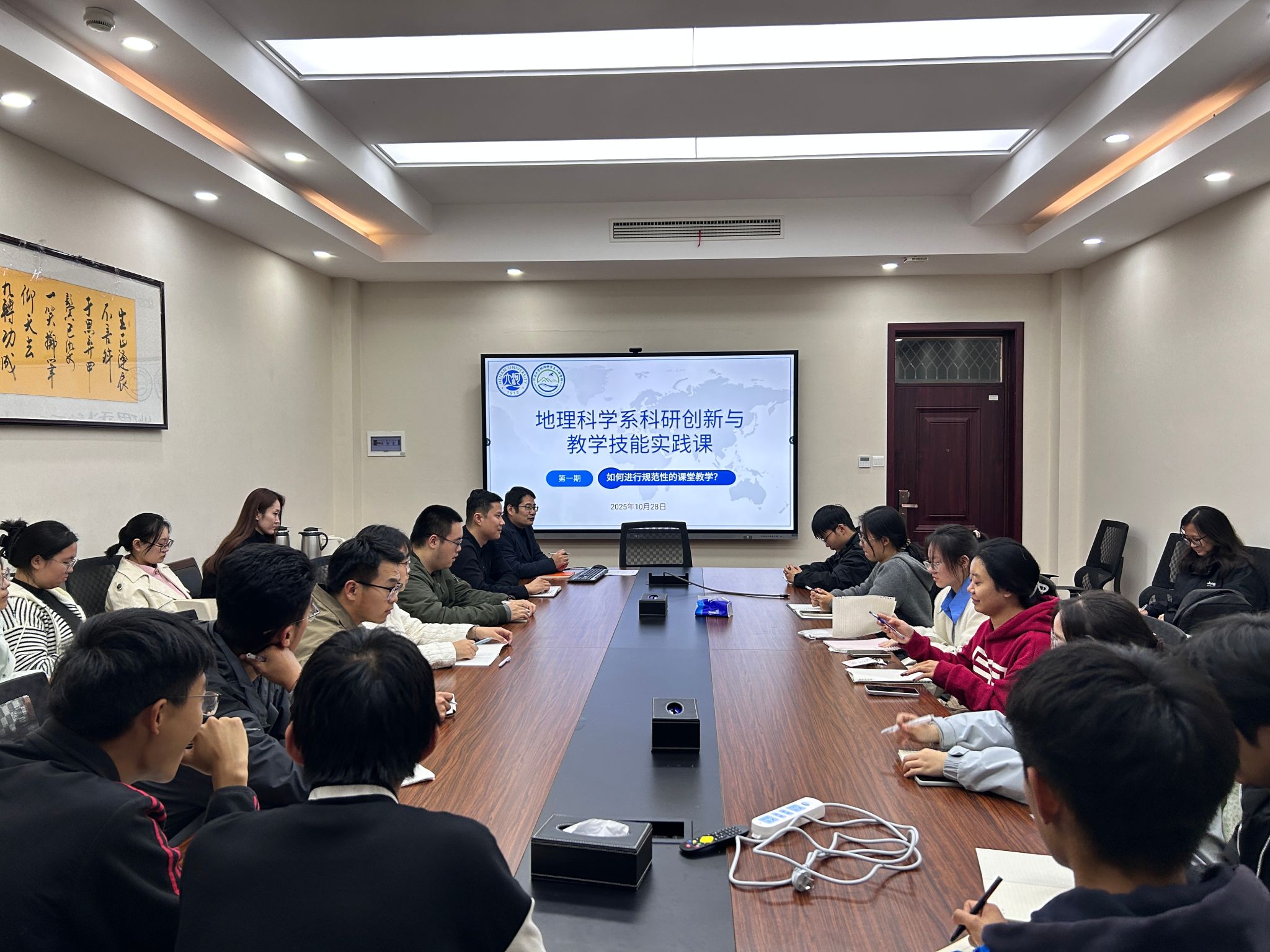 课程第二环节是理论学习。在丁志伟的带领下,全体师生共同学习了刚刚发布的《中共中央关于制定国民经济和社会发展第十五个五年规划的建议》(“十五五”规划建议)的重要精神。他一方面系统介绍“十五五”规划建议的主要内容,另一方面结合地理学科专业特色对规划建议中涉及的区域协调发展、生态文明建设、乡村振兴、美丽中国等重大战略进行了深入解读。他勉励同学们要将个人专业学习与国家发展需求紧密结合,把论文写在祖国的大地上,为实现中华民族伟大复兴贡献地理学人的智慧和力量。
